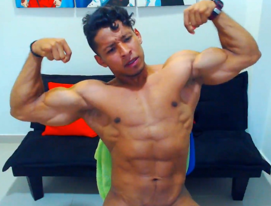 He has a very muscular body, he poses whole body to show his big quads and calves then continues flexing his massive chest and splitt, round biceps with all the great poses, especially front double and single biceps right into the cam.