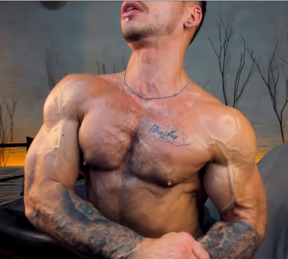 After oilin up his vascular upper body he poses in a fantastic long show, pops out all his big veins on shoulders, chest n arms, flexes hard very close to cam to let the viewers enjoy his breathtaking shape2 weeks out from contest (new music added).