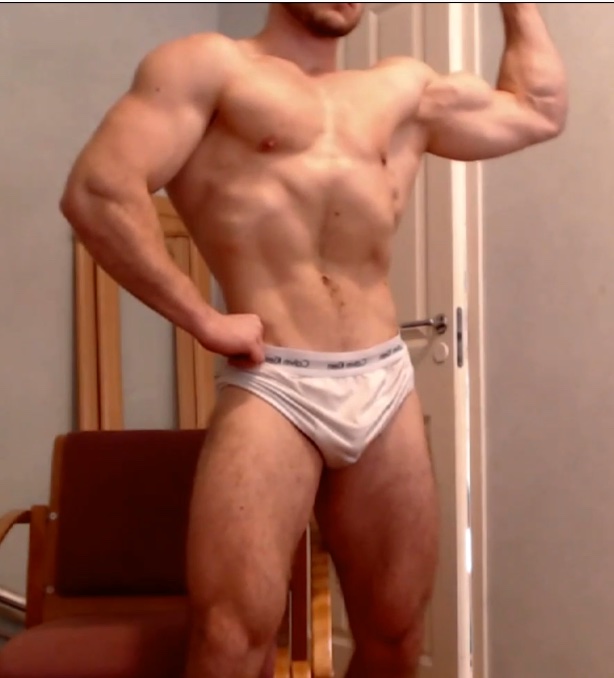 He is 23 y/o, trains for 4 years, 1.79 tall, 85 kg with 43 cm biceps. He likes to show off, loves to pose the front double biceps, huge legs, wide back n strong chest in a very powerful, erotic style.